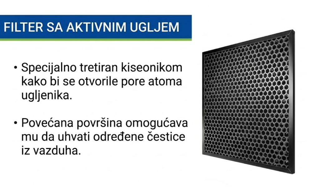 Troslojna filtracija (primarni filter, HEPA visoke efikasnosti, aktivni ugalj) pokriva prostorije od 28 do 48 m².